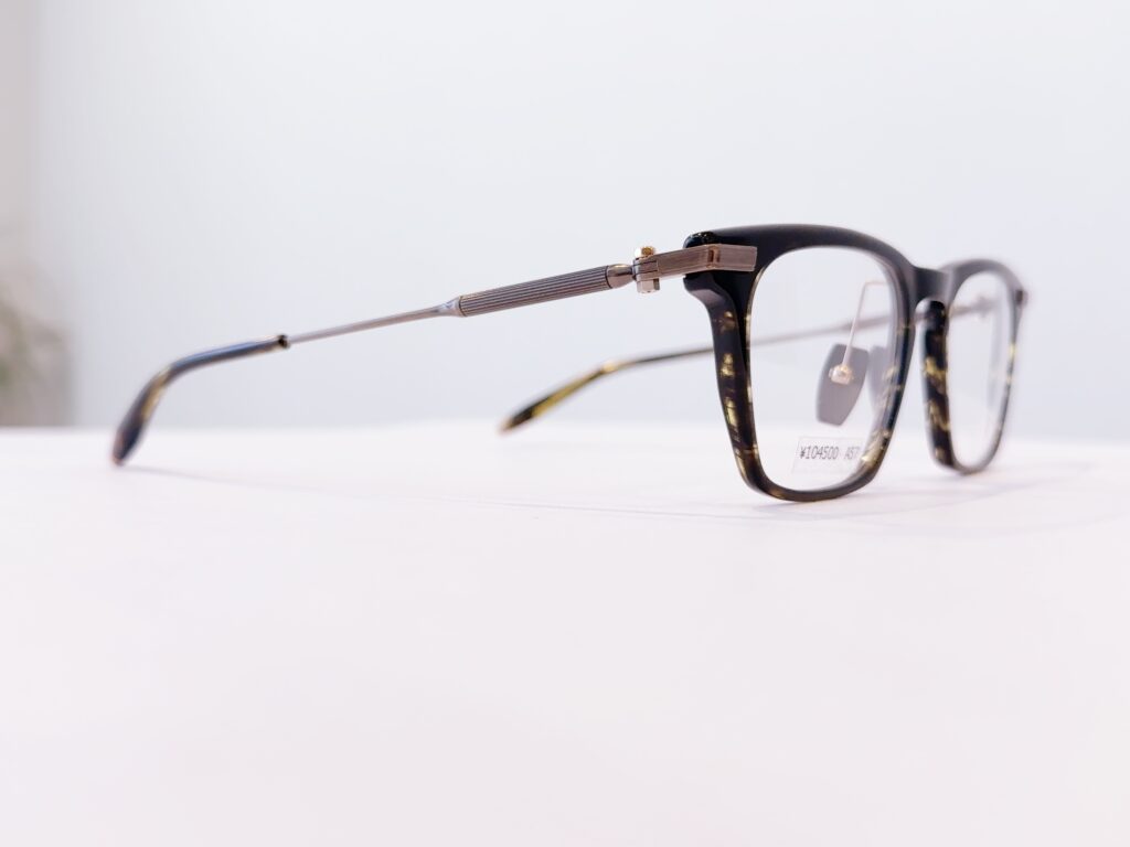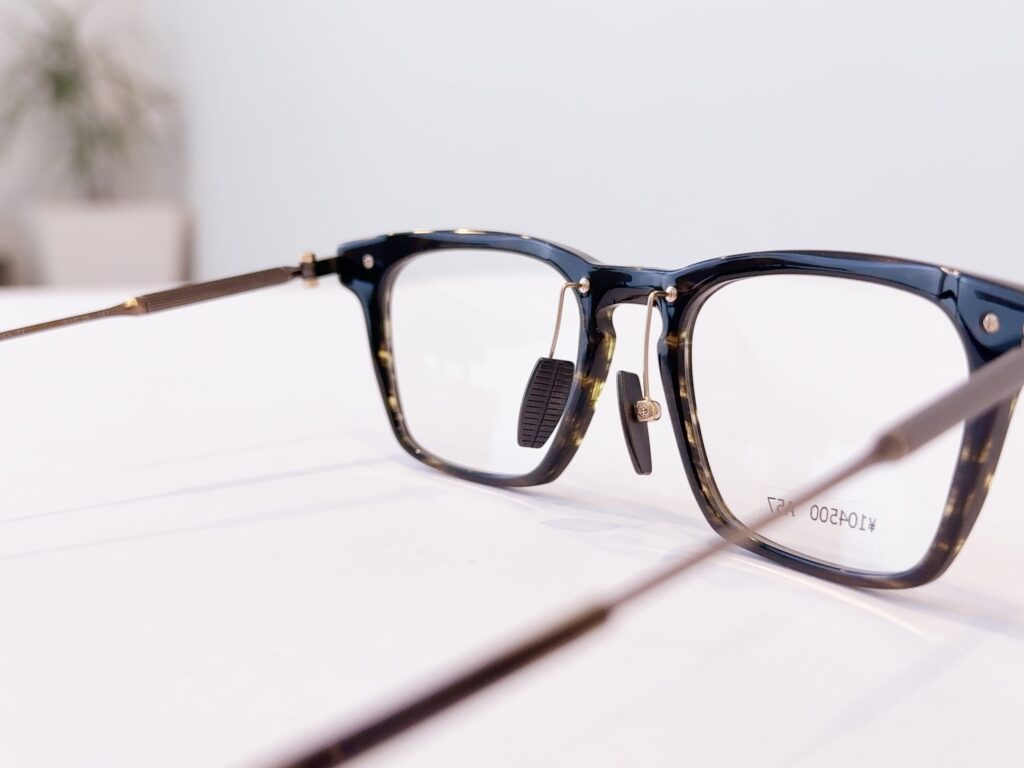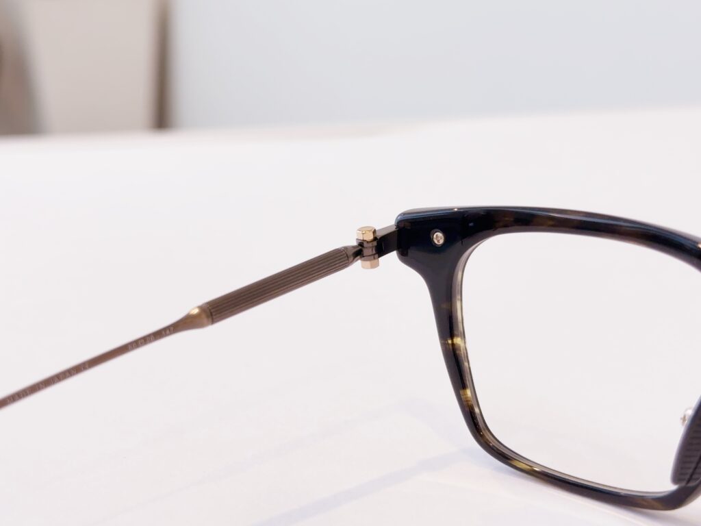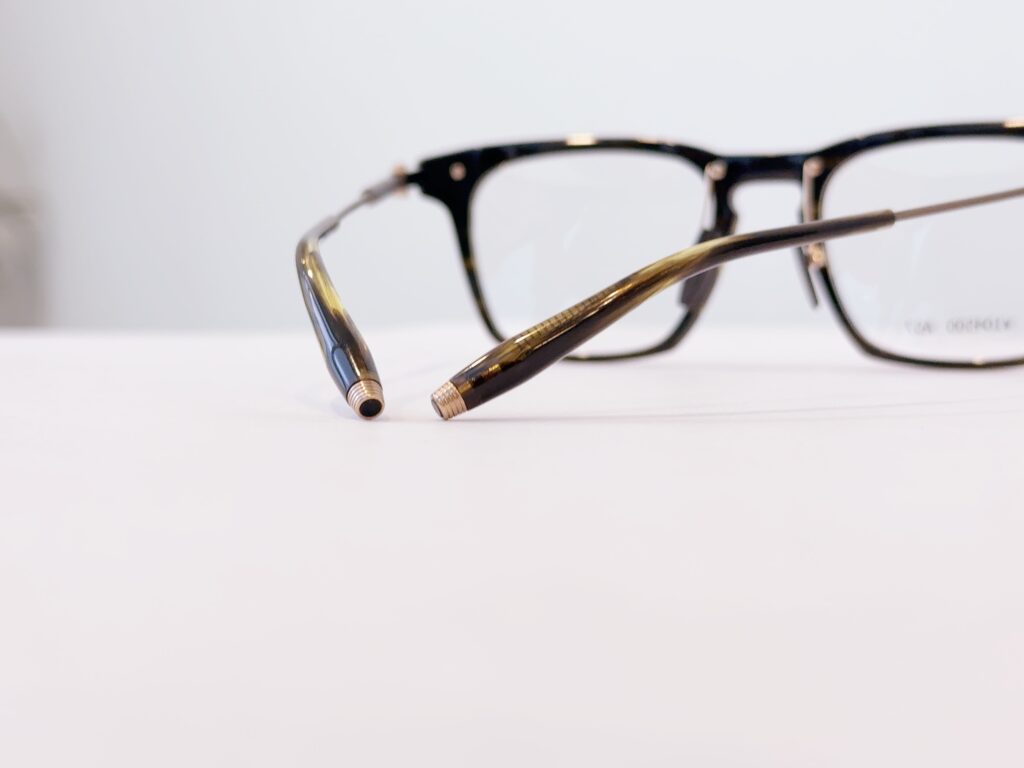 テンプルエンドは万年筆のグリップから着想を得た形で、万年筆のように一生物で使って欲しいと言う想いと、万年筆を握った際の当たりの良さを耳でも再現することで、長時間掛けていてもストレスがないように考えられています。