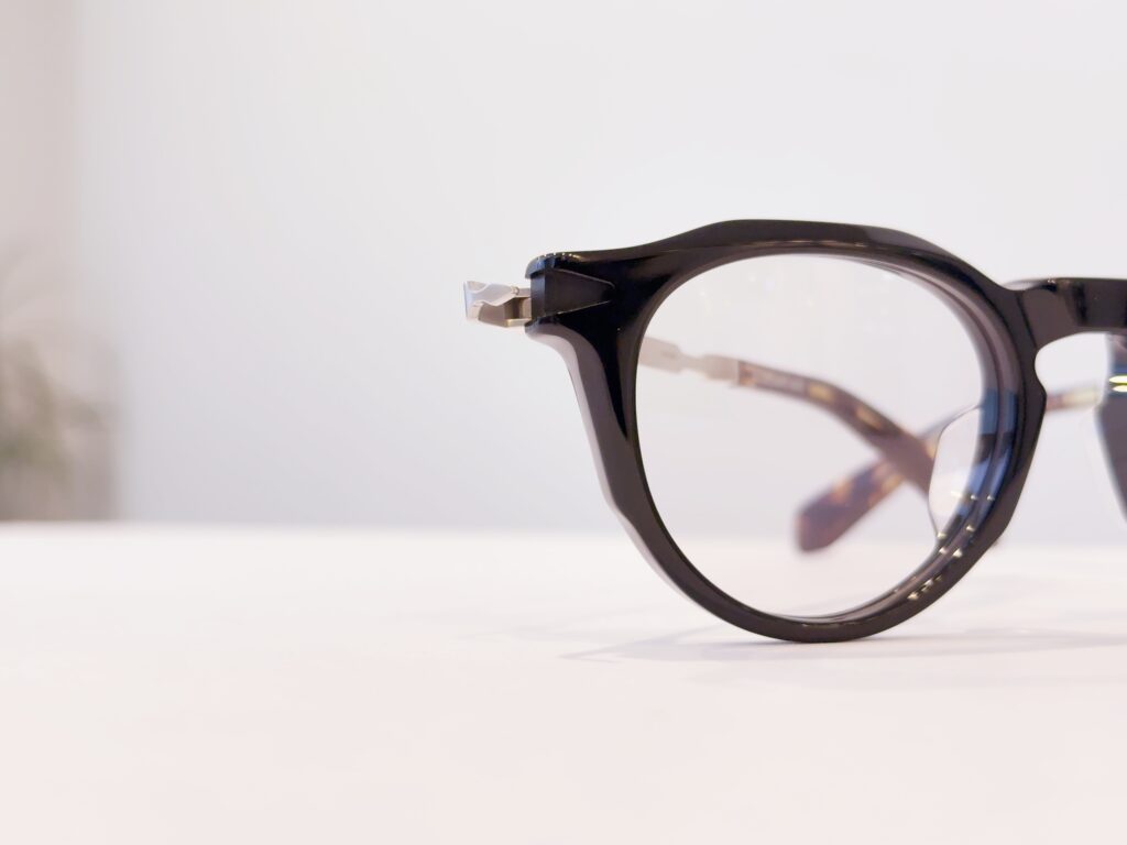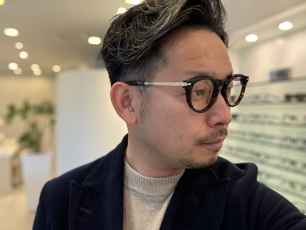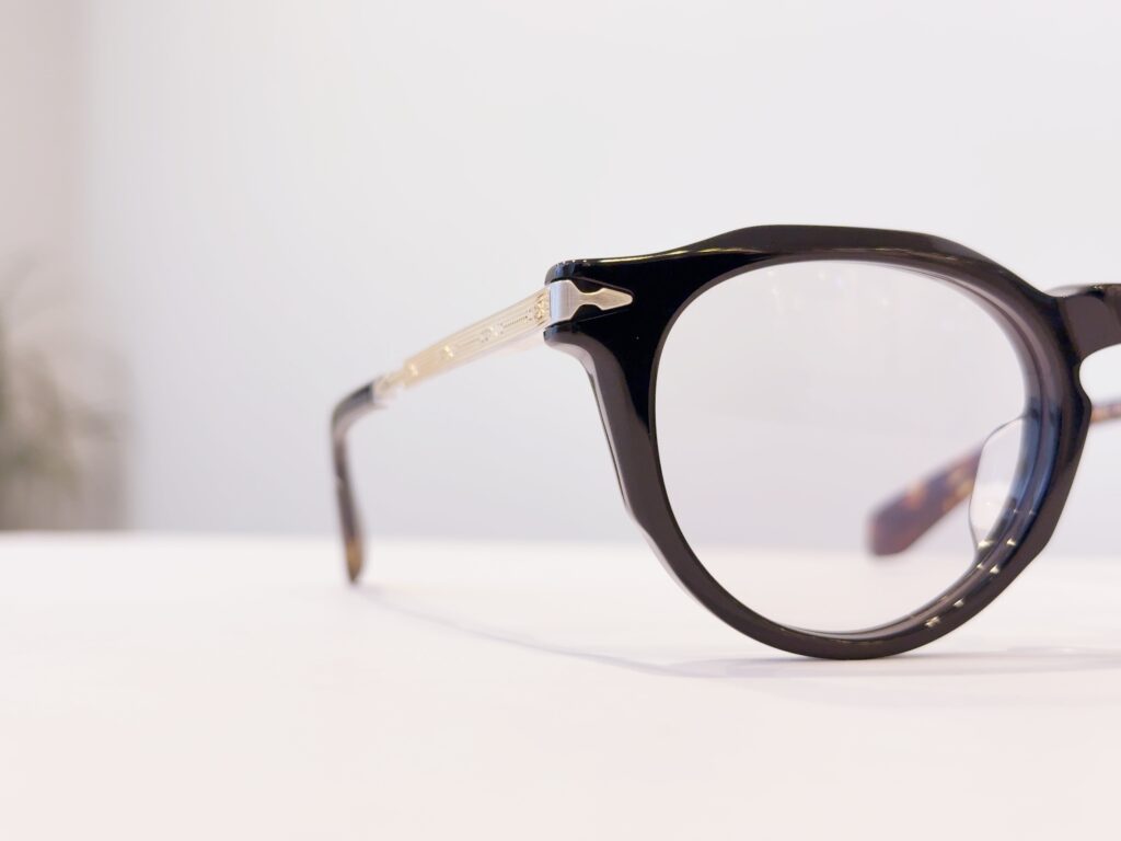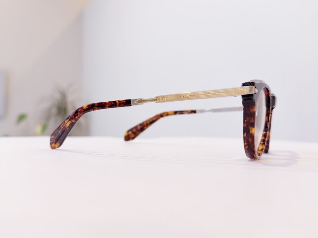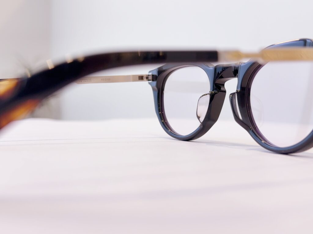 フロントに掘られた三角形の溝にテンプルを開くと付け根の装飾がピタッと収まるこの感じも堪らん!!!!!